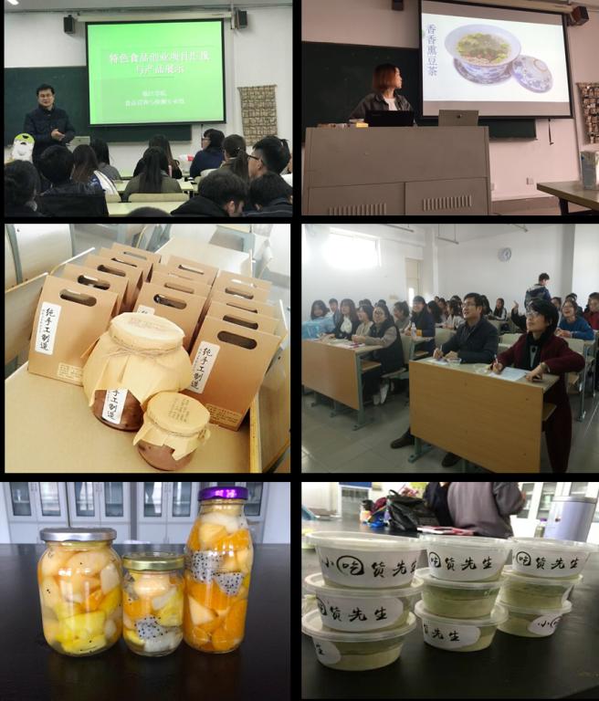 这两天,唐平老师给食品15级的学生上了别开生面的《食品储藏和保鲜》课,这次课的主题是特色食品创业项目与产品展示。课堂交给了学生,老师仅是主持人兼评委之一。两个班16个小组八仙过海,各显神通,课堂气氛异常活跃,每组ppt讲解和产品展示品尝,有教师组评委和各组评委给出成绩,最后教师进行点评。课前两周,结合课程内容,预先给学生分配了任务,学生们都兴致很高,每个小组从市场调研、查阅标准、配方和工艺制定、产品包装设计、价格定位再到制作ppt,团队精诚合作,无论理论知识、操作技能还是综合能力都得到明显提高。