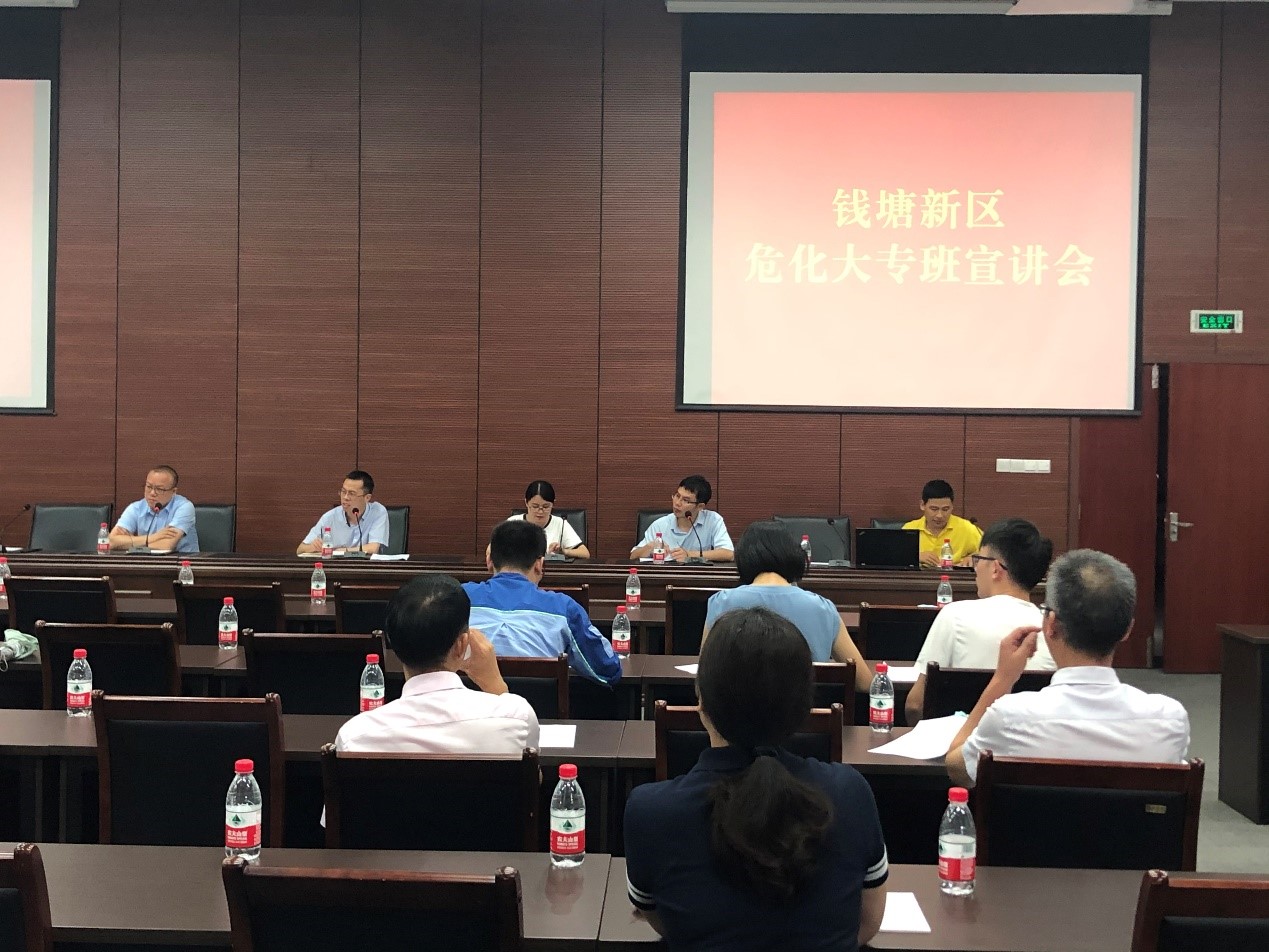 2020年7月10日下午,应钱塘新区应急管理局邀请,精细化工技术专业负责人吴健在临江街道二楼临江厅参加了化工专业“大专班”(即学历提升班)宣讲会,临江学院综合办主任朱海东、继教院毛宇辉老师也应邀参会。