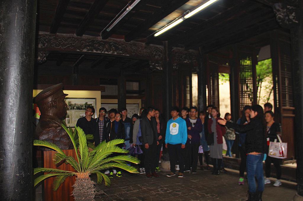 穿过修建后的将军桥,经过约40米的银杏树道,步入新四军苏浙军区纪念馆,左侧是粟裕同志骨灰敬撒处的石碑,右侧是新四军苏浙军区纪念碑。 跟随讲解员的步伐,来到了第一展厅,大厅正上方是粟裕同志的铜像,左右各有一盆铁树相伴,后面有“军民团结无往不胜”的金色大字。第二展厅主要展示了司令员粟裕、政治委员、副司令员、参谋长以及一、二、三、四纵队包括第一军分区第二军分区的主要领导姓名和职务。解说员详细讲解了新四军的诞生、重建及发展的全过程,当时的长兴战役、泗安战役、合溪炸碉堡等战斗过程及当时壮烈牺牲的铁军战士。第三展区展示了新四军当时使用的武器装备,包括很多新四军当时使用过的生活用品和医用器具,如土枪、卡兵枪、机枪,布鞋、军衣、军冒、毛竹纽扣、药钳子、探针、蒸笼等等。经过走廊,看到是当时用于革命《火线报》、《苏浙日报》、《苏南报》等报纸的印刷工具,还有粟裕同志的办公真实写照和作战时的沙盘图。随后,参观了江南红楼——蜡像馆。