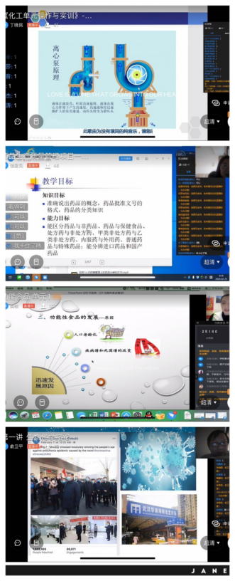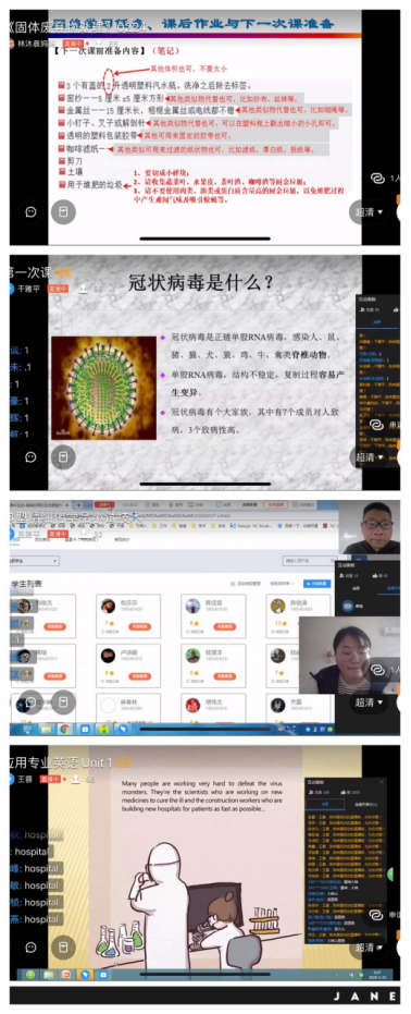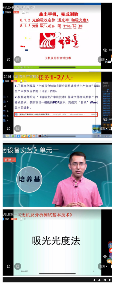 为了避过网络“早高峰”,老师们都早早的进入了直播课堂,甚至最早7:30就开启了直播画面,提醒大家正式上课时间。上午8:15分4个专业11个班级8门专业课程同时开启,老师们精心准备好教学材料,包括整体设计、单元设计、PPT、导学单、电子教材、课堂测验等。教学设计也按照在线课的特点来安排,理论教学的同时也合理安排线上的实践环节,并结合课程开展疫情防控教育。环境工程技术专业的《固体废物处理课程》把本来在实训室完成的固体废物堆肥项目经过重新设计安排学生在家完成;食品专业的《食品质量管理与安全控制》、《食品微生物检验技术》课程、药品专业的《生物化学》、《药品生产质量管理》课程、精细化工专业的《化工安全与标准化》、各专业《专业英语》等课程都结合新冠病毒、生命安全的内容开展疫情防控教育;省级精品在线开放课《仪器分析测试技术》、《制药设备务实》结合丰富的教学资源开展线上翻转课堂教学。老师们通过直播与学习通、课堂派、省级精品在线课程平台相结合,开展直播教学与课程平台互动与作业提交的混合式教学,课堂中师生互动性频繁,获得学生普遍好评。与此同时,药品生产技术专业教师面向师生开展的新型冠状病毒防疫系列讲座也在本周开讲啦!