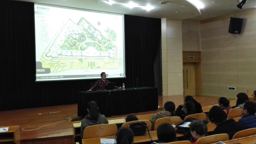 李寿仁高工身兼数职,是浙江省花协园林景观专家委员,浙江省花协庭院植物与造景分会副会长,杭州市风景园林学会专家,浙江大学讲座教授,杭州市园林绿化股份有限公司常务副总、兼副总工程师、景观效果总监。讲座中,他首先就他自身参与的两个工程案例,向同学们展示了园艺园林行业的前景,尤其是植物造景、景观配置。他说这是一个值得期待的行业,目前能做好的人很少,同时又是一个需要同学们学会坚持的行业,大学三年是入门,工作三年是入行,要入道需要同学对专业的热爱。