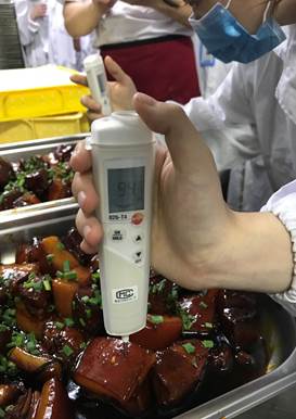 此次深入食堂后厨,既是现场教学,又是实地演练。教学的内容为餐饮机构卫生管理的重点检测项目,包括现场抽样、餐具洁净度检测、煎炸油品质检测、饭菜中心温度检测、蔬菜的农药残留检测五个项目,强调专业、规范、准确、快速。提高学生操作技能的同时,注重职业素养的培养。