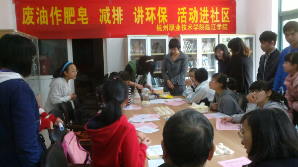 3月30日上午,由开发区环境监测站主办、杭州职业技术学院临江学院环境监测专业承办的“废油变肥皂,环保不伤手”——环保普及活动,在下沙开发区白杨街道文汇苑拉开帷幕。