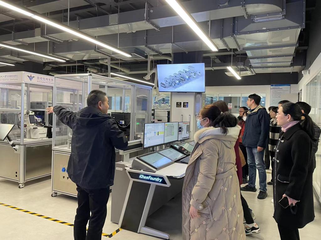 何艺一行参观了生物与分子智造研究院iChemFoundry化学自动化合成平台和iBioFoundry合成生物学自动化高通量实验平台以及相关实验室,iChemFoundry平台总架构师潘建章介绍了平台的建设情况、主要研究方向以及在人才培养、技术攻坚、产业孵化和社会服务等方面的具体举措。