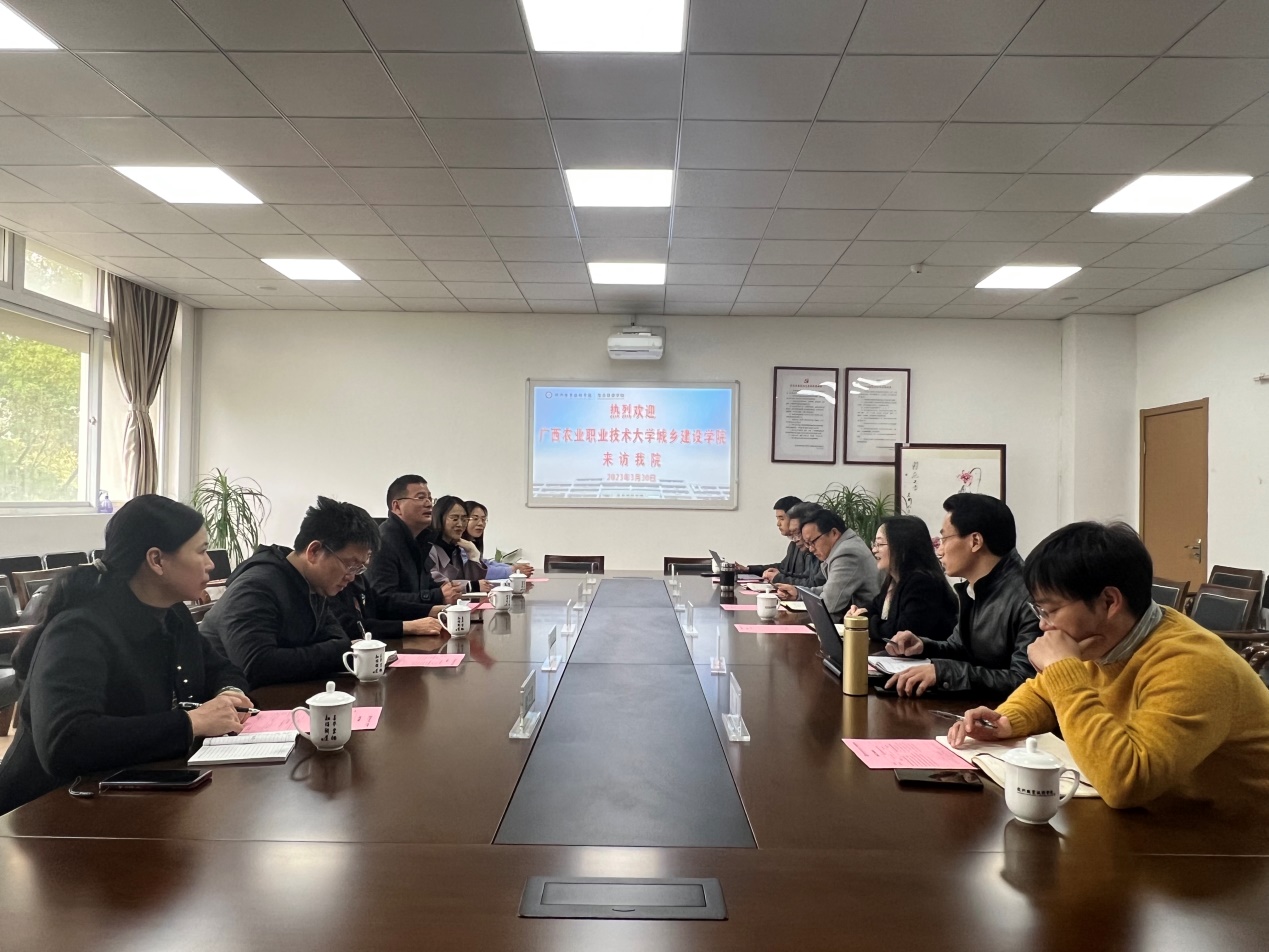 3月30日上午,广西农业职业技术大学城乡建设学院副院长(主持工作)傅秀红一行6人来访我校。304永利院长何艺,实训服务与管理中心负责人俞卫平、环境工程技术专业负责人何连军及部分专业老师参与接待。