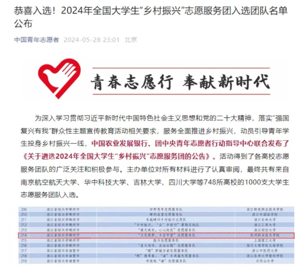 为深入学习贯彻习近平新时代中国特色社会主义思想和党的二十大精神,落实“强国复兴有我”群众性主题宣传教育活动相关要求,服务全面推进乡村振兴,动员引导青年学生投身乡村振兴一线,中国农业发展银行、团中央青年志愿者行动指导中心联合发布了《关于遴选2024年全国大学生“乡村振兴”志愿服务团的公告》。活动得到了各高校志愿服务团队的广泛关注和积极参与,主办单位对所有材料进行了认真审阅,最终共有来自南京航天航空大学、华中科技大学、吉林大学、四川大学等748所高校的1000支大学生志愿服务团队入选。304永利“文化筑梦,乡音守望”志愿服务队成功入选。