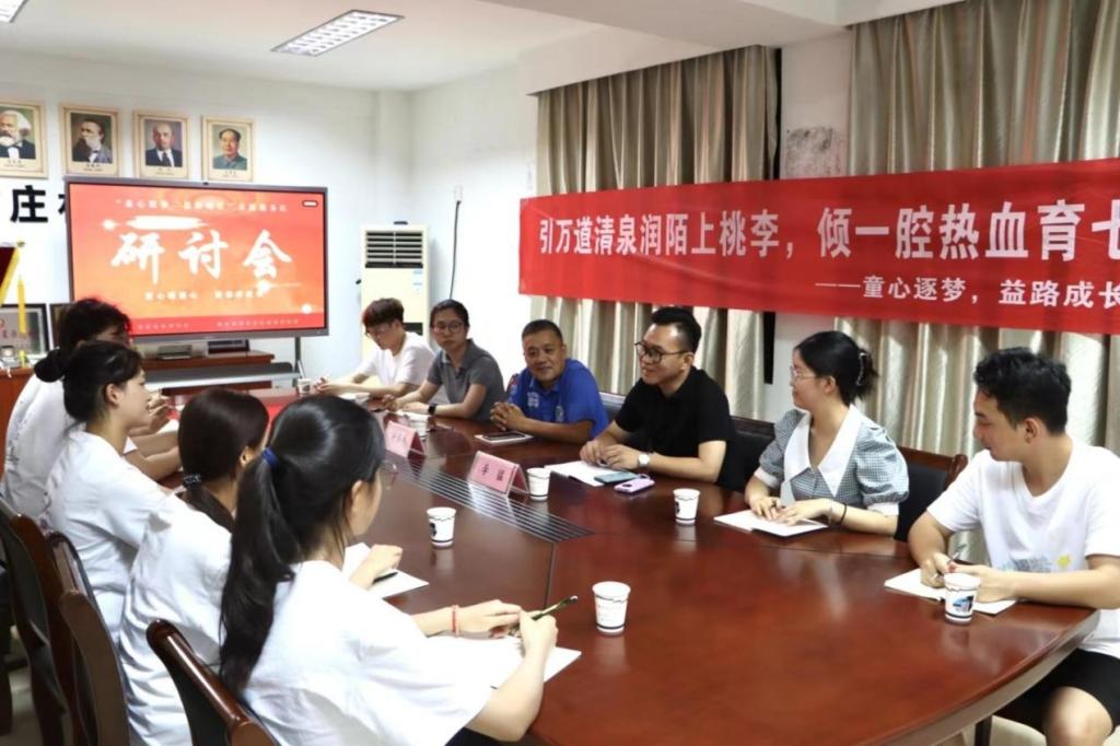团队有幸邀请到了许多件书记和两位大学生村官在南庄村文化大礼堂,共同以“引万道清泉润陌上桃李,倾一腔热血育七彩之花”为主题开展研讨会。双方相互介绍,同学们踊跃发问,书记耐心细致解说。通过本次交流座谈会,校村双方在乡村基层服务、孩童文化教育等方面达成共识,在构建和谐乡村、促进志愿交流等方面形成了合力。双方将持续推进交流合作、资源共享、优势互补,实现真正意义上的互助共赢。