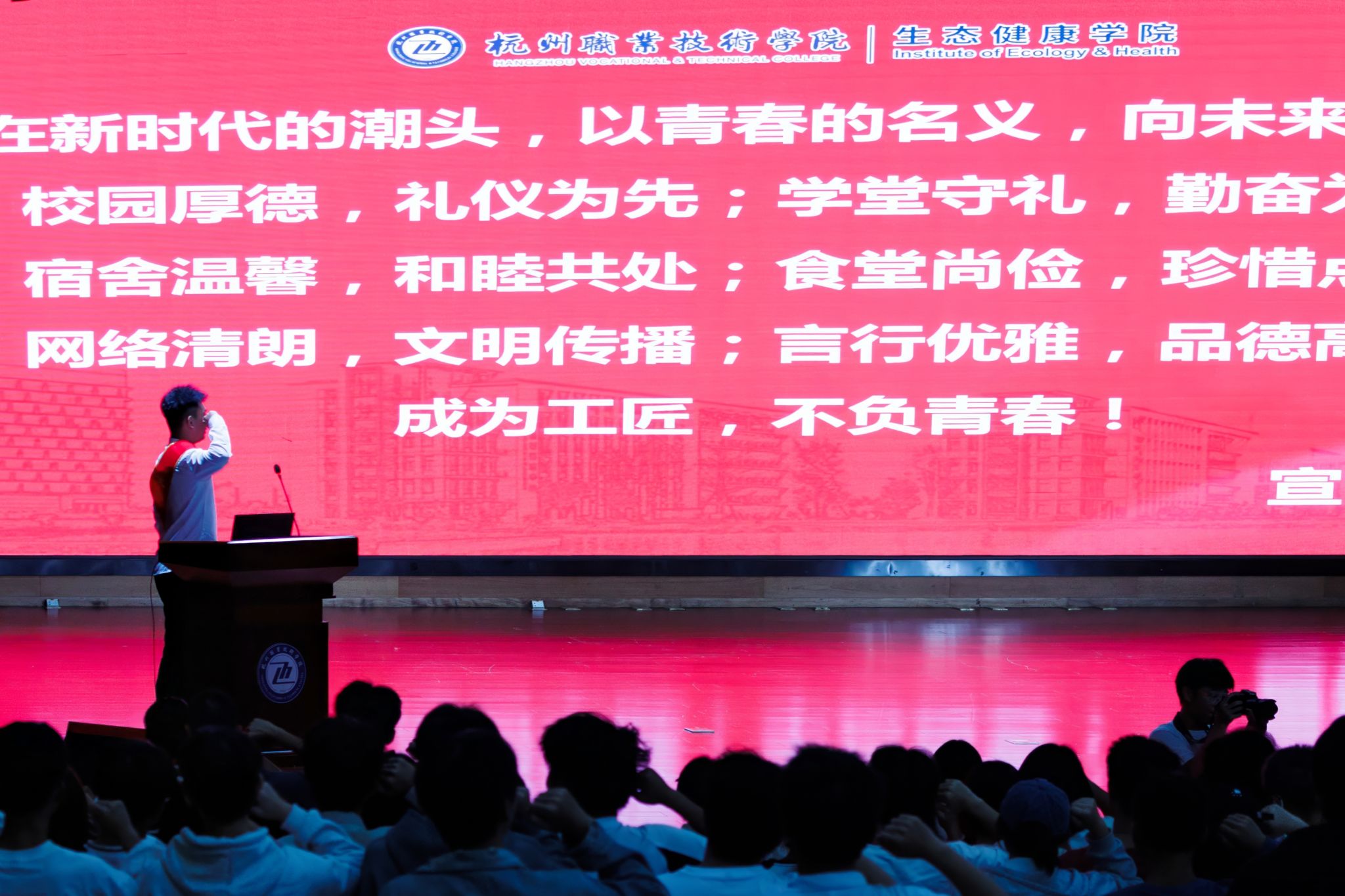 人无礼则不生,事无礼则不成,国无礼则不宁。为积极营造文明、和谐的育人环境,引导学生弘扬和践行社会主义核心价值观,进一步推动学校“杭职有礼”文化品牌和学院“化育天工、精诚至善”文化品牌创建,切实提升文明素养,10月12日下午,304永利在图书馆报告厅召开“尚德明礼守法”学生文明修身暨道德法治教育系列活动启动仪式。