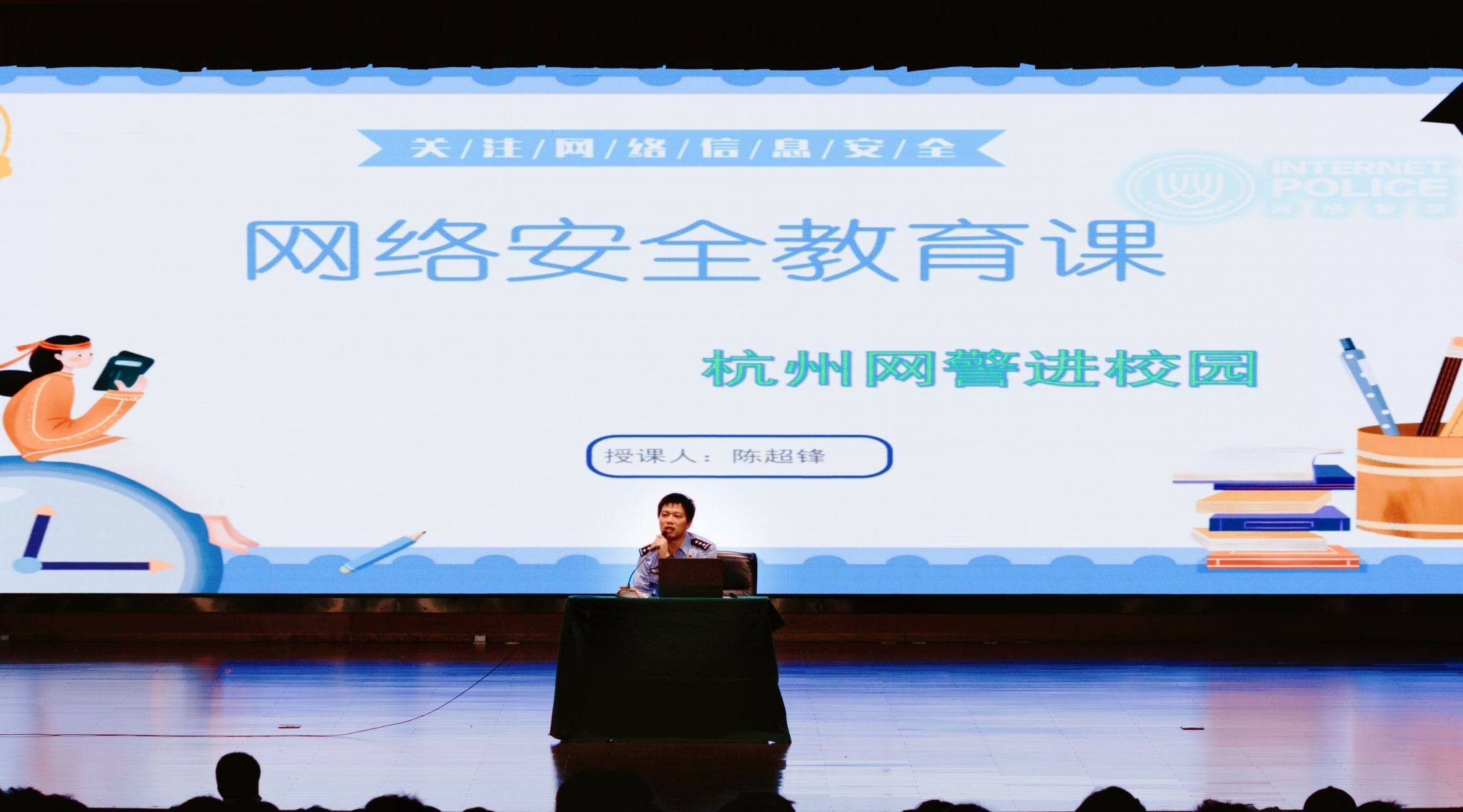 之后,学院联合保卫处特别邀请钱塘公安分局网警大队的民警陈超锋带来了一场主题为《知法于心,守法于行》的网络安全教育讲座。陈警官结合丰富的工作经验和生动案例,深入浅出地讲解了网络安全的重要性和相关法律法规,并传授了实用的网络安全技巧和防范方法。他提醒新生时刻保持警惕,保护个人隐私和信息安全,避免陷入网络诈骗等陷阱。