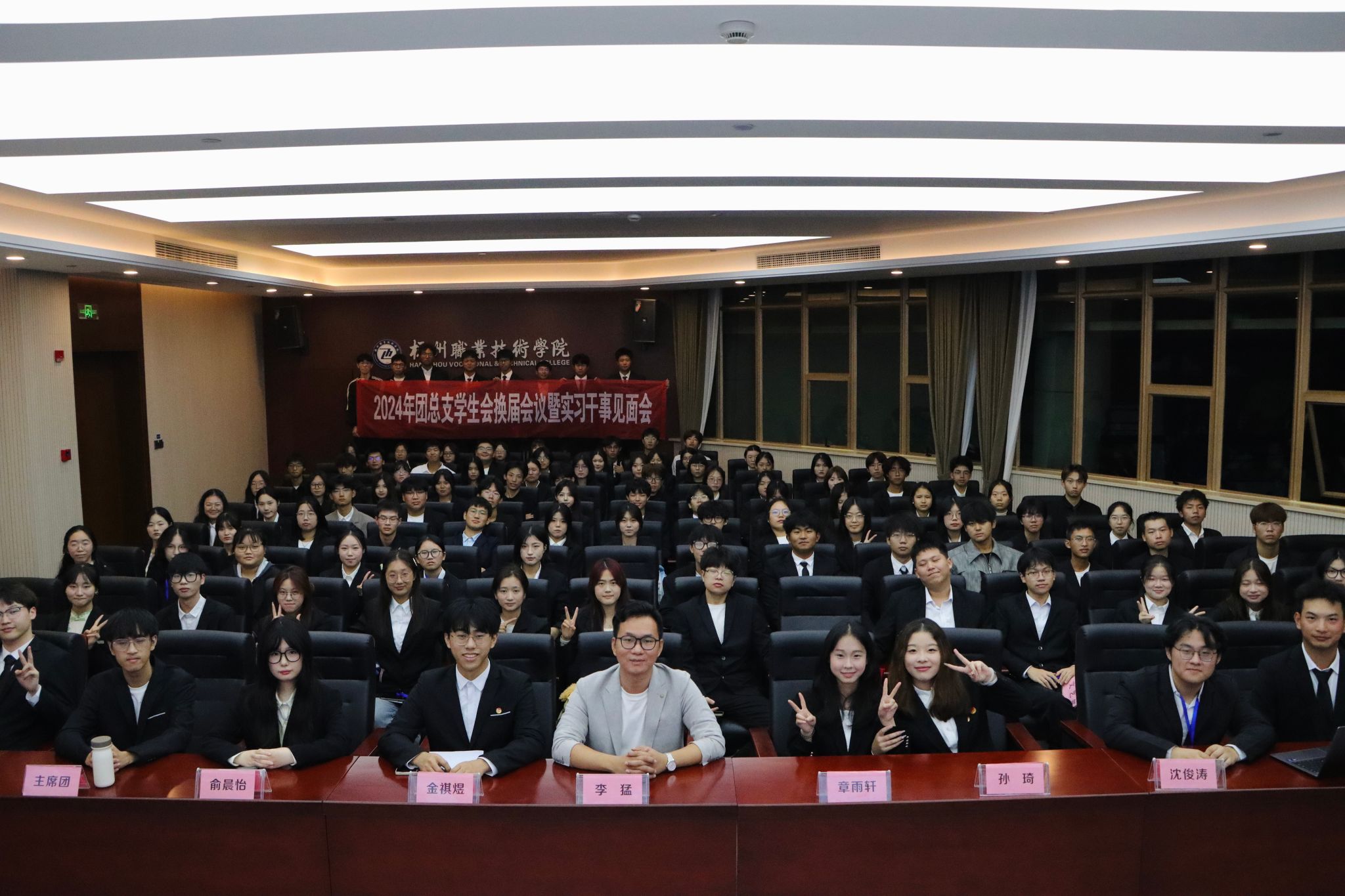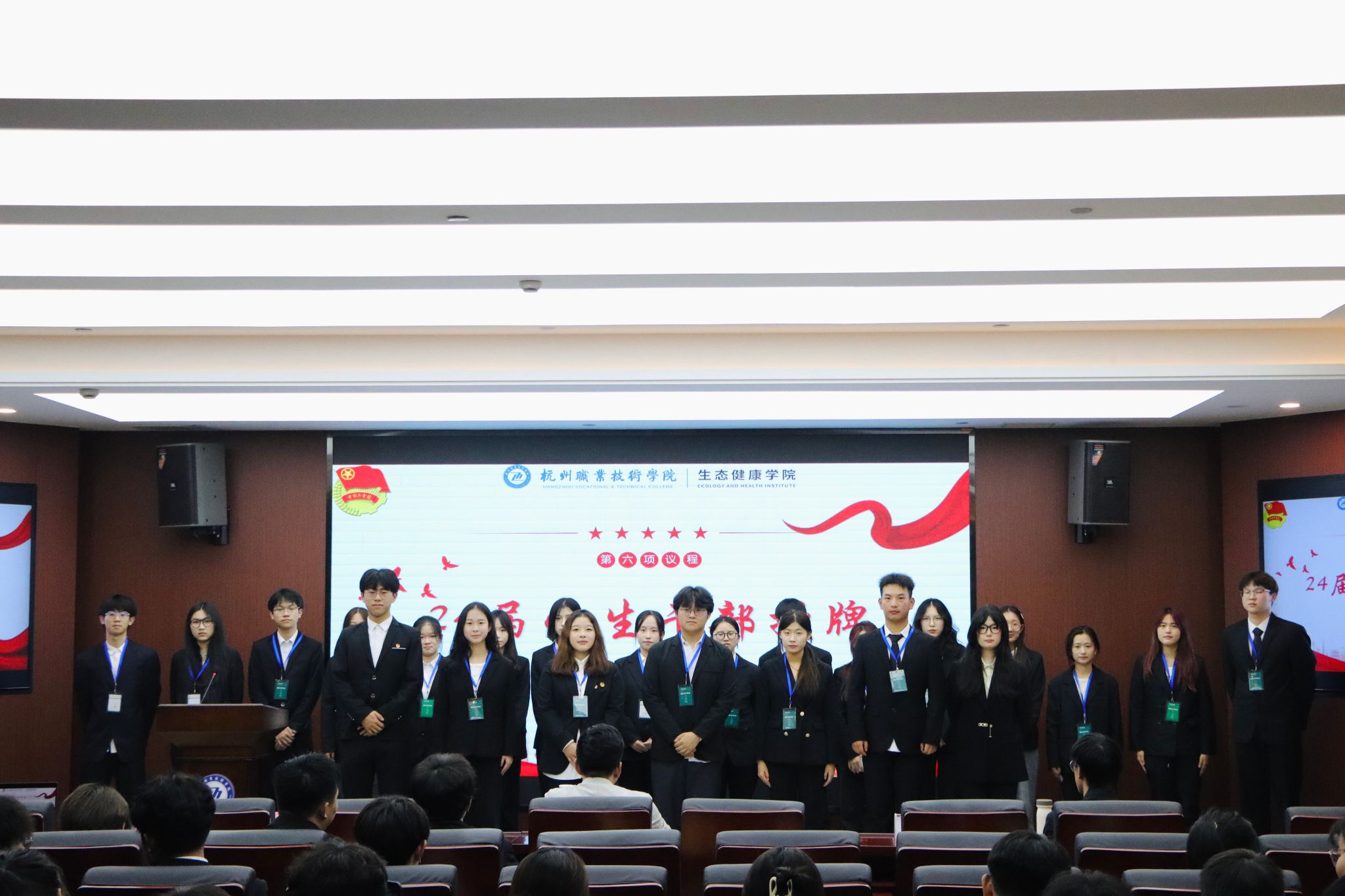 会议在庄严的国歌声中拉开序幕,全场人员肃立,共同奏唱国歌,氛围庄重而神圣。第四届团总支学生会主席金祺煜发表了鼓舞人心的讲话。团总支副书记俞晨怡上深情回顾了与学生会成员们携手并进的岁月,分享了宝贵的成长经验,并对新一届团队寄予了殷切期望。他们共同为新任学生干部授予象征荣誉与责任的工作牌。