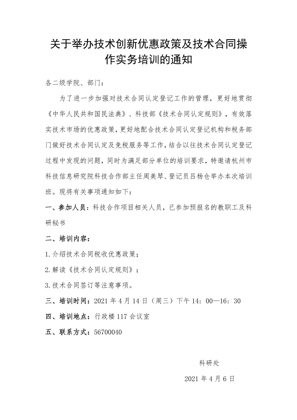 关于举办技术创新优惠政策及技术合同操作实务培训的通知