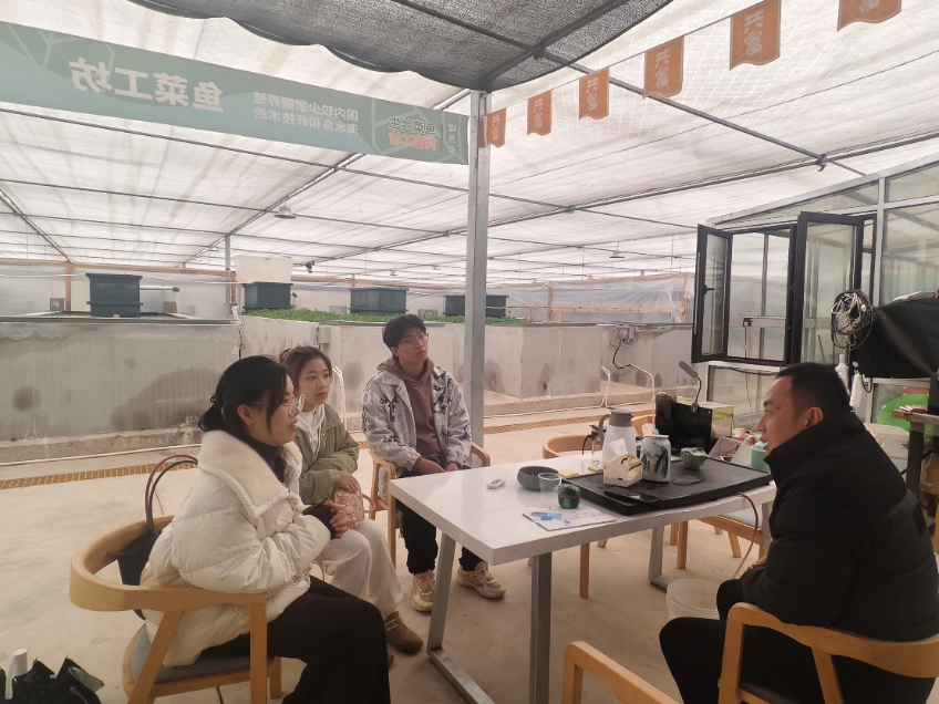团队实地考察了基地养殖区、种植区及尾水处理系统,详细了解尾水净化、营养盐循环利用、鱼菜协同生产等运行现状与技术难点。师生结合环境工程与生态修复专业背景,就尾水污染物去除、系统水质调控、作物适配性等问题与企业技术负责人深入交流。