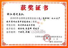 近年来,专业学生获得浙江省大学生科技创新活动计划暨新苗人才计划5项,“挑战杯-彩虹人生”全国首届职业学校“挑战杯”创新创业创效竞赛特等奖1项、最佳创意奖1项,浙江省高职高专院校“挑战杯”创新创业竞赛特等奖1项、一等奖2项、二等奖2项。 近年来学生参加大赛硕果累累,获得国家级技能竞赛15次,其中一等奖2次,二等奖4次,三等奖9次;省级竞赛获奖20次,其中一等奖4次,二等奖7次,三等奖9次。涉及化工生产技术、化学实验技术、现代化工HSE技能大赛等多个全国性比赛。