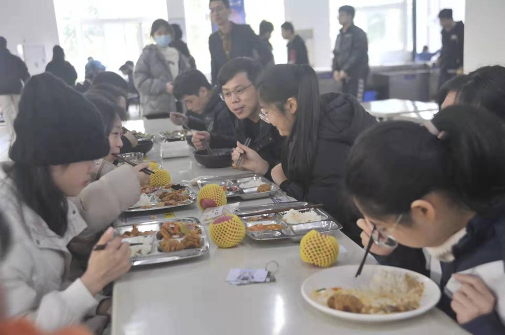 年关期末,12月31日中午,304永利党总支书记、院长童国通,副院长何艺,党总支副书记胡严,学工办主任王晓磊与分院学生共进午餐。