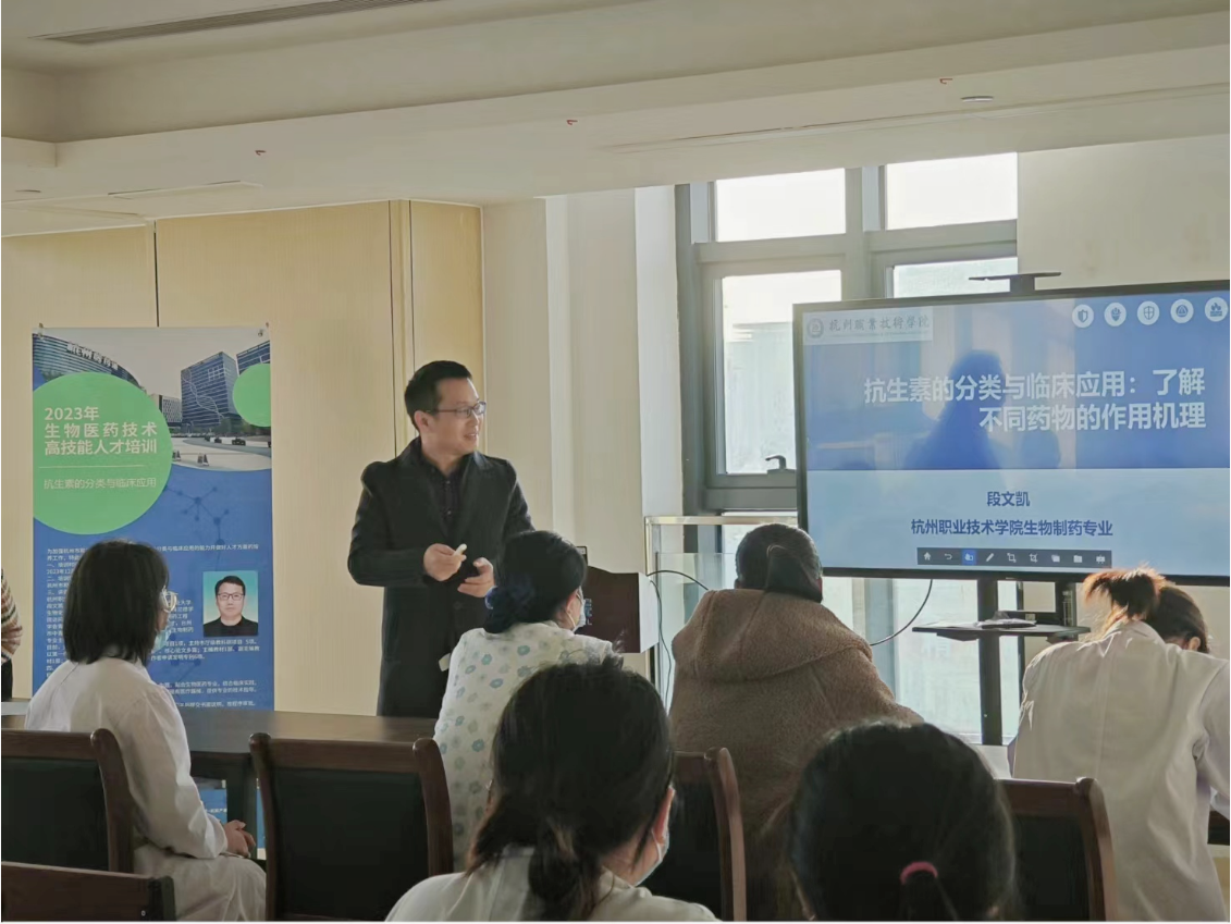 12月6日,杭州医药港产教融合基地安排老师赴钱塘区和禾医院开展“抗生素的分类与临床应用培训”生物医药技术高技能人才培训,由304永利段文凯主讲,和禾医院100余位医务人员和制药领域相关人员参加了培训。