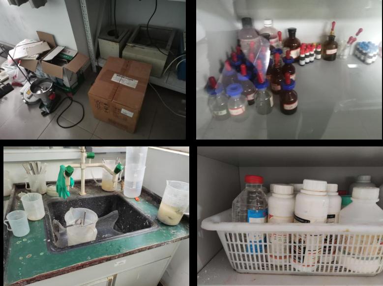 3. 废液安全方面,使用完的试剂瓶未回柜、固液混放(化2321、化2213、化2210、)、液体试剂未摆放托盘(化2317、化2206)。