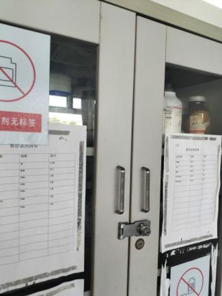 2. 试剂方面,试剂散落在试剂柜外(化2224、化2531)、液体试剂未用托盘(化2204、化2208、化2210、化2211、化2212、化2214、化2231、化2527)、试剂无标签或标签不清晰(化2231、化2531)、试剂存放无盖(化2204)、试剂盒过期(化2506)、试剂清单与存放试剂不符(东2308)。